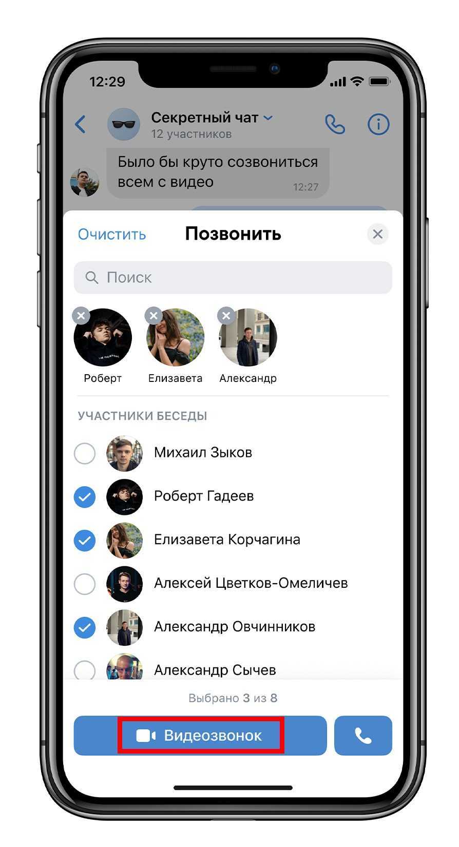 Если требуется совершить групповой звонок, предварительно выбираем всех пользователей, которые являются участниками одной беседы и внизу экрана тапаем «Видеозвонок»: