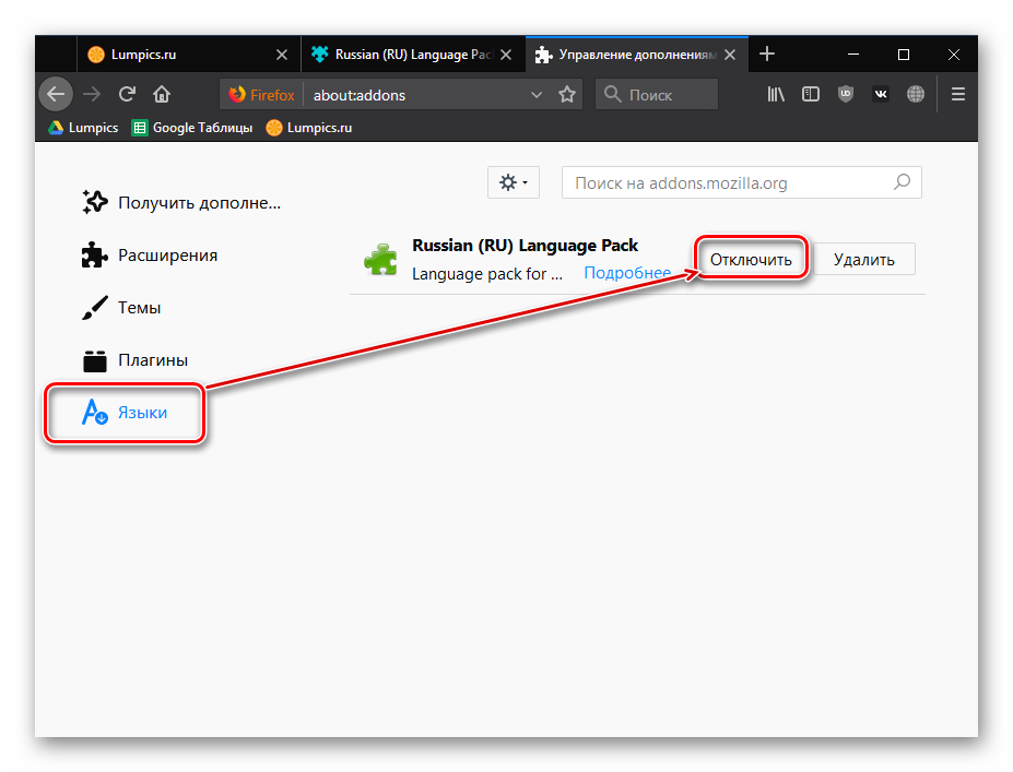 Вы также можете попасть туда, просто нажав сочетание клавиш Ctrl + Shift + A или написав в адресной строке about:addons и нажав Enter. Переключитесь на раздел «Языки» («Languages») и удостоверьтесь, что рядом с Russian Language Pack кнопка, предлагающая его «Отключить» («Disable»). В этом случае просто закройте вкладку и переходите к следующему шагу. Если название кнопки будет «Включить» («Enable»), нажмите на нее.