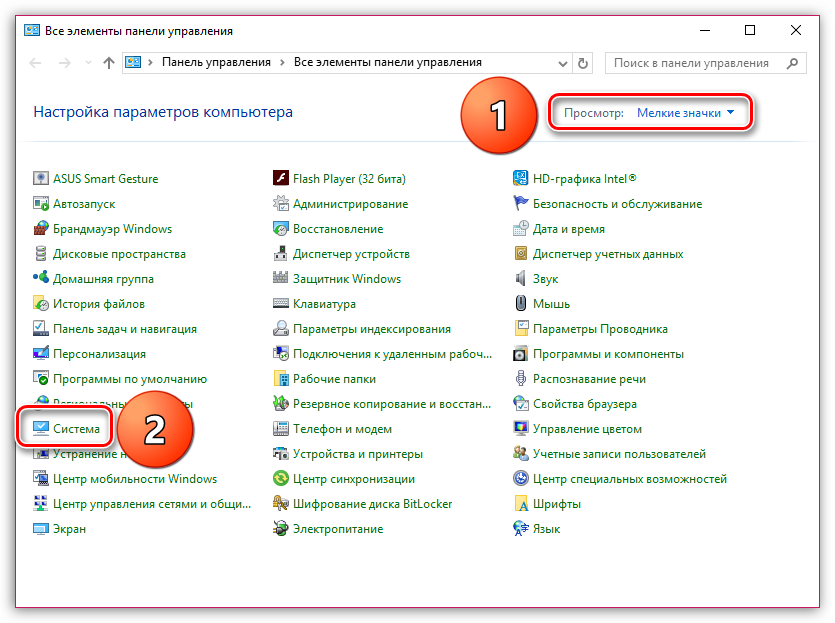 Если вы не знаете, какая разрядность у вашего компьютера, тогда откройте раздел «Панель управления», установите в верхнем правом углу режим просмотра «Мелкие значки», а затем откройте раздел «Система».
