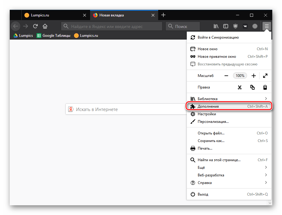 Для начала в меню браузера Mozilla Firefox необходимо выбрать вкладку «Дополнения» (Add-ons).