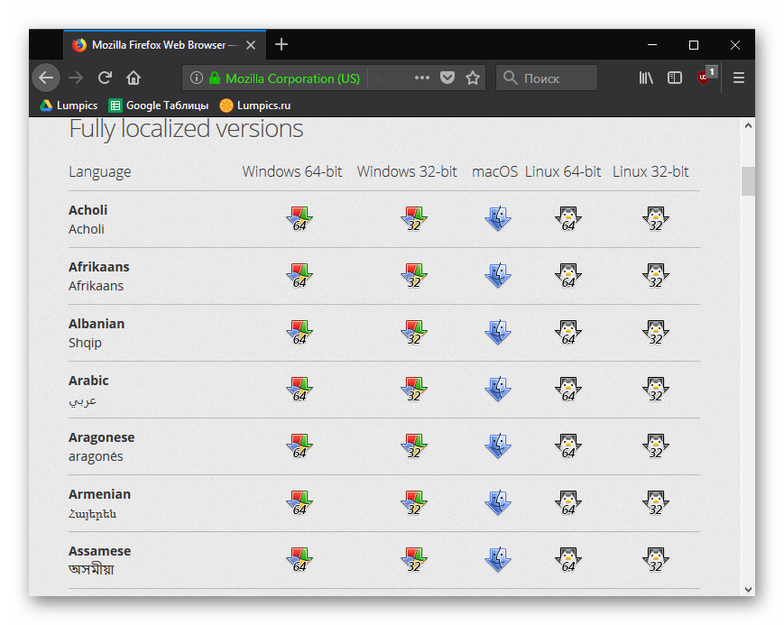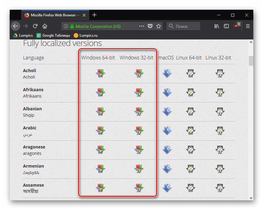 Обратите внимание, что здесь потребуется выполнить загрузку браузера не только с учетом требуемого языка интерфейса, но и в соответствии с версией операционной системы. Так, для ОС Windows здесь предложено сразу две версии Mozilla Firefox: 32 и 64 bit