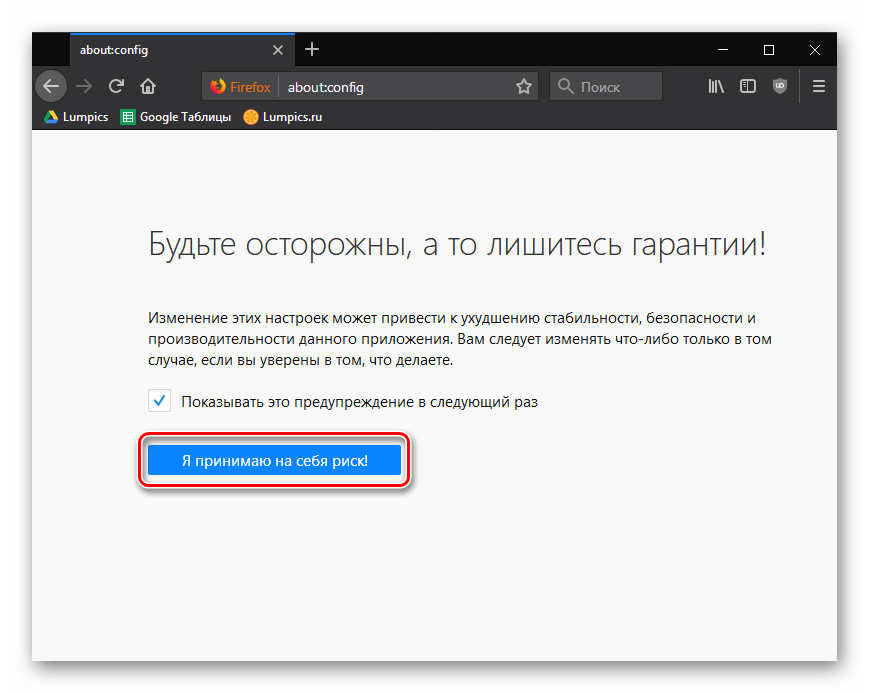 2) Введите в адресную строку about:config и нажмите Enter. В появившемся сообщении кликните по кнопке «Я обещаю, что буду осторожен!»;