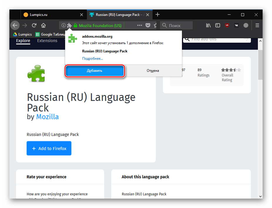 - Откройте браузер и перейдите на страницу установки русского языкового пакета — Mozilla Russian Language Pack.