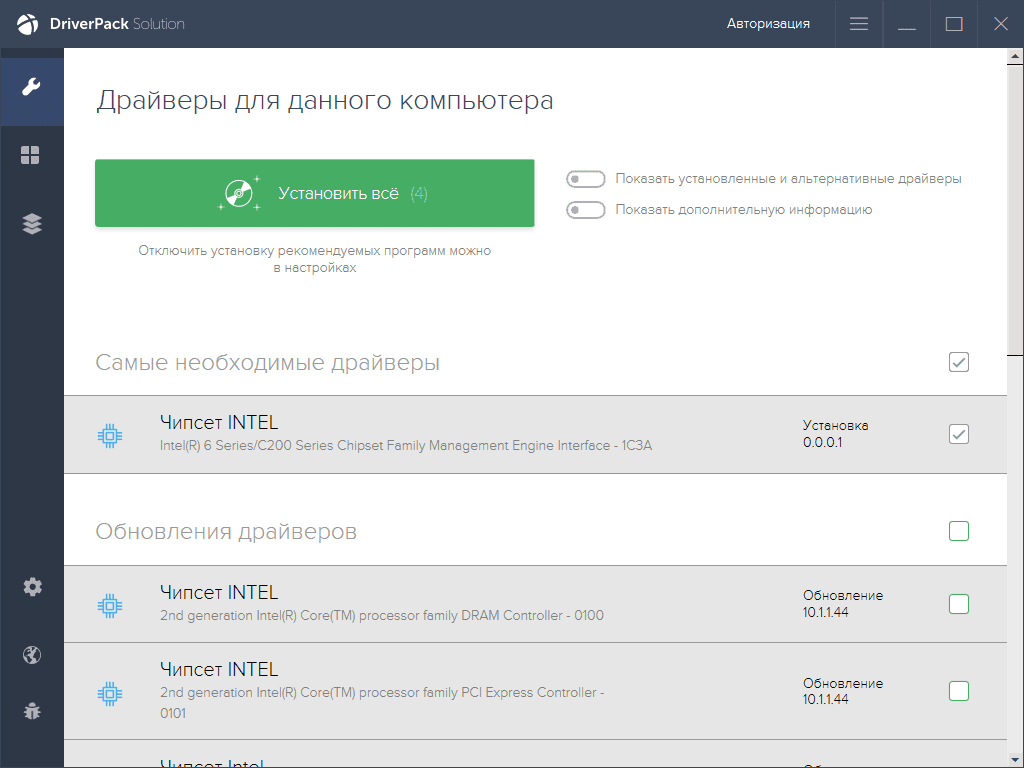 - После выбора необходимых драйверов нажимается кнопка «Установить всё» в русской версии ПО. Других настроек для работы софта не требуется.