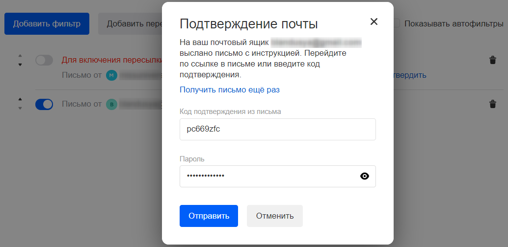 - По завершении нажать «Создать фильтр». Будет предложено ввести текущий пароль электронной почты на Яндексе. Вписать его, чтобы подтвердить действие.