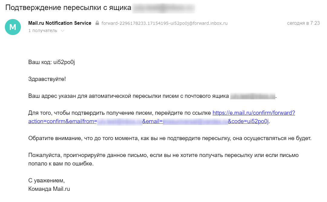 Теперь вам нужно перейти в ту почту, которую вы указали для пересылки писем и подтвердить пересылку туда. Это делается в почтовых сервисах для того, чтобы вы не смогли пересылать письма на какие попало адреса, к которым не имеете доступа.