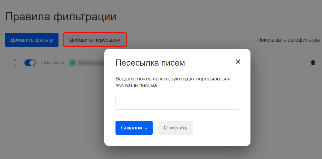 - В поле рядом вводите электронный адрес того, чью корреспонденцию хотите пересылать.