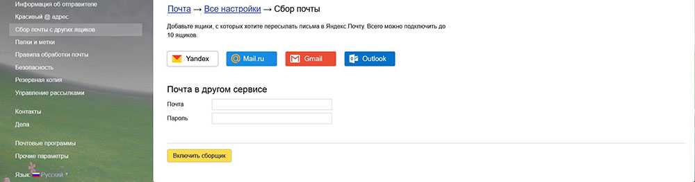 В Яндексе также есть опция по быстрому добавлению других почтовых сервисов. Для этого нужно перейти в настройки и выбрать «Сбор почты с других ящиков».