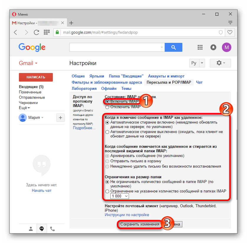 Сначала нужно проверить, включен ли протокол IMAP, по которому будет работать почтовый клиент. Этот протокол позволит не только получать письма, но и синхронизировать папки с письмами между Outlook и Gmail.