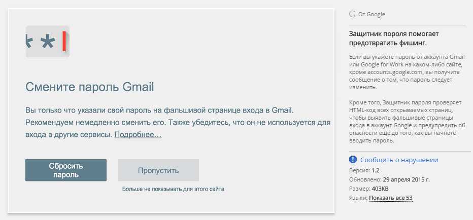Вы когда-нибудь задумывались о том, насколько безопасна ваша почта? Советуем дополнительно защитить ее и хранящуюся там информацию от сторонних посягательств. Например, с помощью бесплатного расширения Google. Оно создано специально для защиты от фишинга. Если логин и пароль от вашей почты введут с незнакомого сайта, вы получите предупреждение. Таким образом, у вас будет время, чтобы поменять пароль и защитить свой аккаунт от злоумышленников.