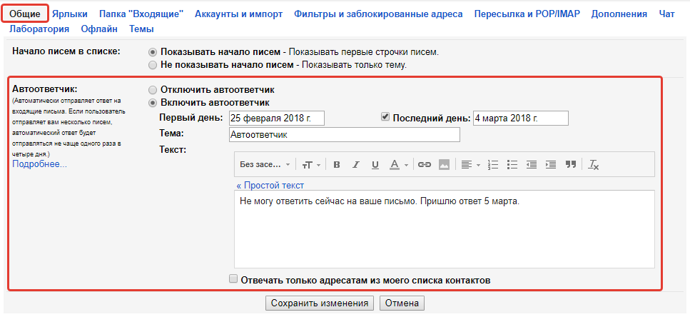 Автоответчик настраивается в разделе “Настройки” — “Общие”. В самом низу нужно отметить пункт “Включить автоответчик”. Далее указывается дата его включения (“первый день”) и при желании дата его автоматического отключения (“последний день”).