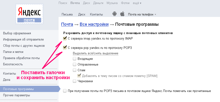 - Поставьте галочку на «С сервера pop.yandex.ru по протоколу POP3» и в пунктах «Входящие», «Отправленные», «Спам», «Черновики».