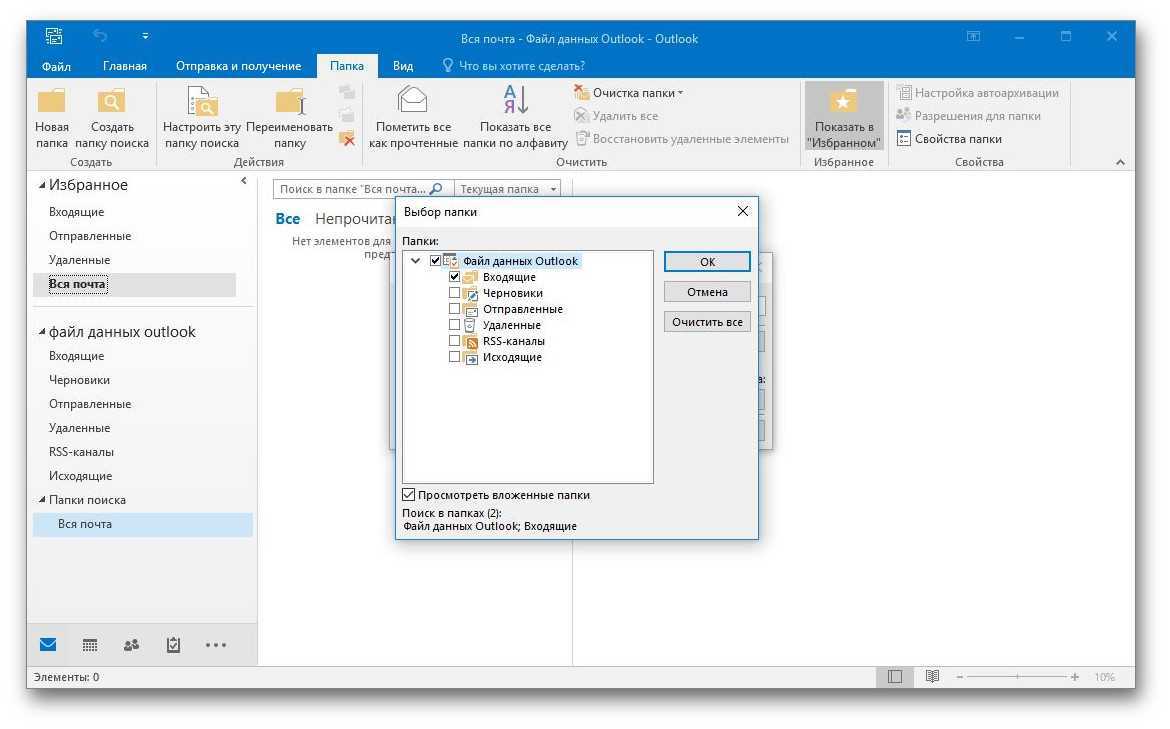 Кликните на «Обзор», выберите все папки и ящики, из которых нужно собирать почту, и отметьте опцию «Поиск во вложенных папках».