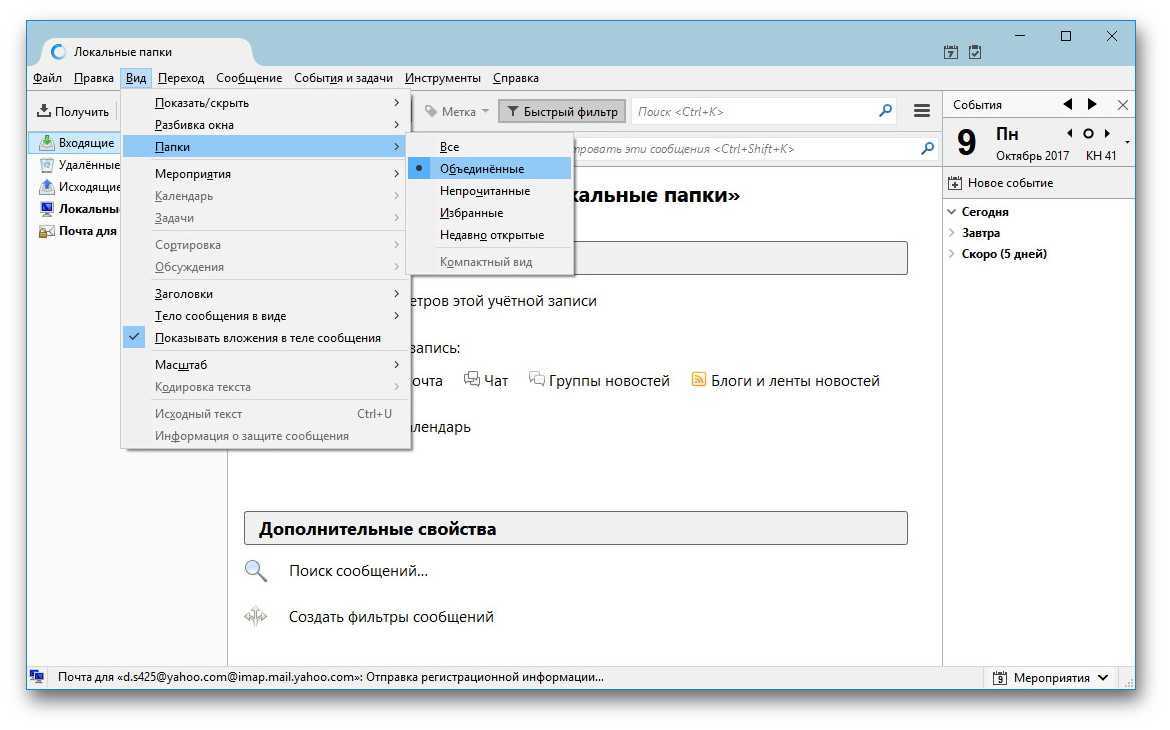 В Thunderbird собрать все ваши письма в одной папке «Входящие» очень просто. Зайдите в меню «Вид» (если строка меню не отображена, нажмите Alt). Затем выберите «Папки» → «Объединённые». Теперь у вас будет одна папка «Входящие» для новых писем, одна папка «Черновики», одна папка «Отправленные» и один «Архив». Вам не придётся долго искать, что где лежит. При этом сообщения будут, как и раньше, храниться на серверах ваших почтовых провайдеров.