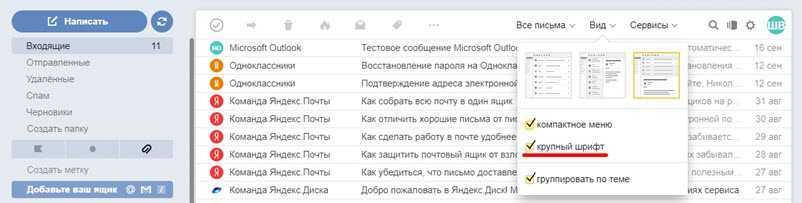 Крупный шрифт. Галочка на этом увеличит размер букв в ящике.