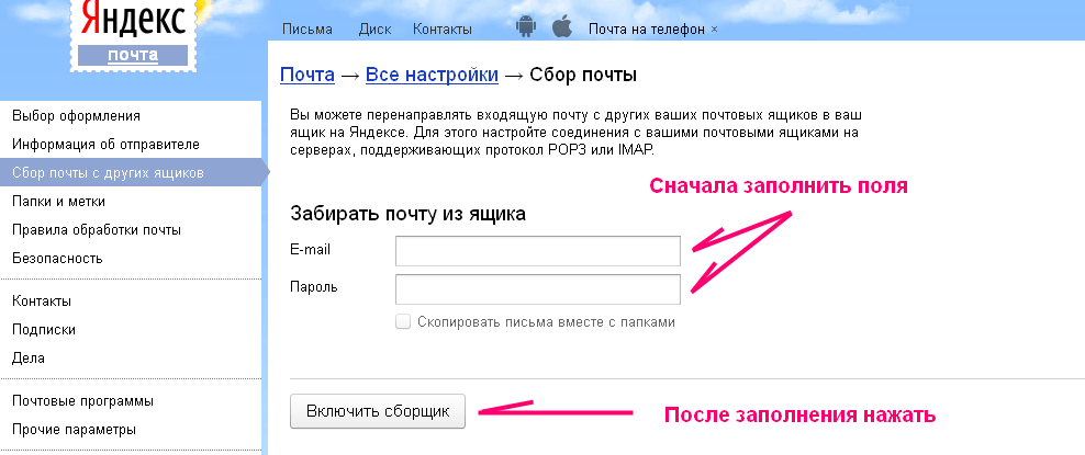 Как настроить сбор почты на Яндекс с любых других ящиков?