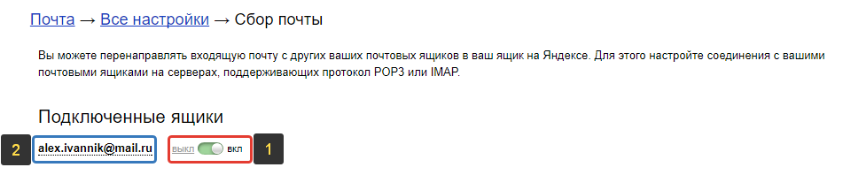 Если нужно выключить или снова включить сбор почты с определённого подключённого ящика, нажмите на переключатель “Вкл. / Выкл.” в списке подключённых ящиков.