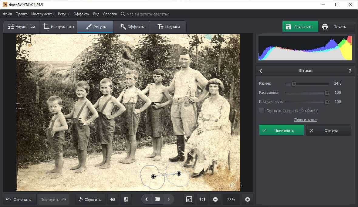 С помощью программы ФотоВИНТАЖ можно легко устранить повреждения и другие дефекты с оцифрованного снимка. Просто выполните следующие действия: