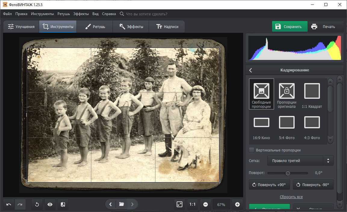 Если у снимка пообтрепались края, во вкладке «Инструменты» воспользуйтесь опцией кадрирования. Просто «срежьте» лишнюю кромку и фото станет аккуратным. В разделе «Геометрия» можно повернуть снимок на необходимый угол и убрать различные искажения, если при оцифровке фотография располагалась неровно.