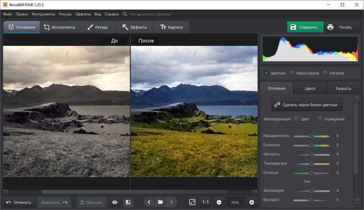 Нажав всего на одну кнопку можно раскрасить чёрно-белый снимок. Программа сама добавит подходящие оттенки, останется лишь внести корректировки при необходимости.