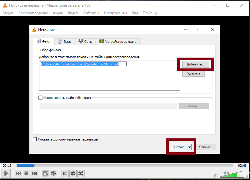 Нужно с помощью проводника добавить определённый фильм в список воспроизведений и нажать «Поток».