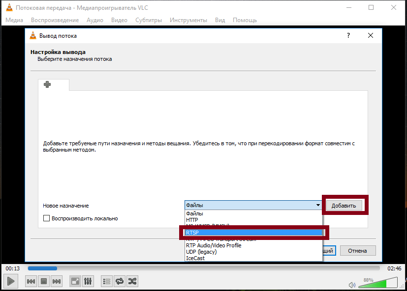 Здесь нужно выбрать протокол для вещания. Отмечаем (RTSP) и нажимаем «Добавить».