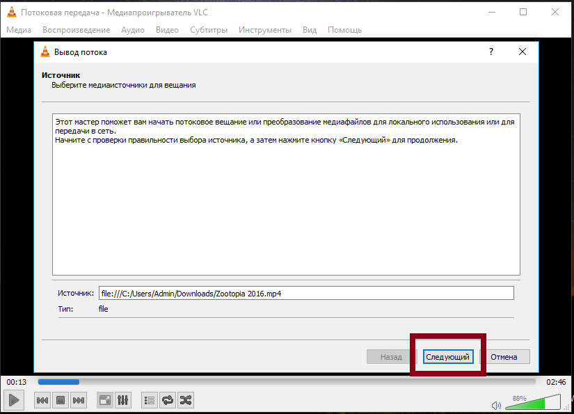 Проверяем, правильно ли мы настроили трансляцию видео. Для этого открываем другой VLC или другой плеер.