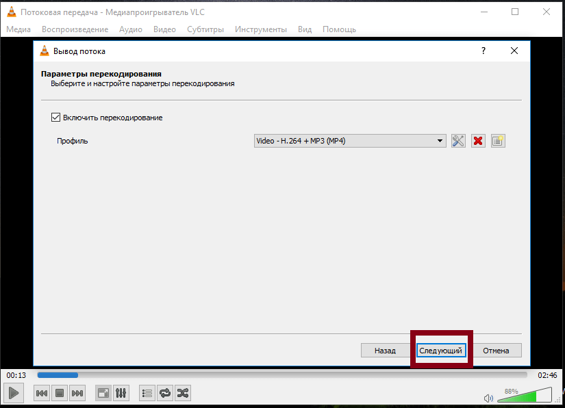 В списке «Профиль» следует выбрать вариант «Video-H.264+MP3 (MP4)».