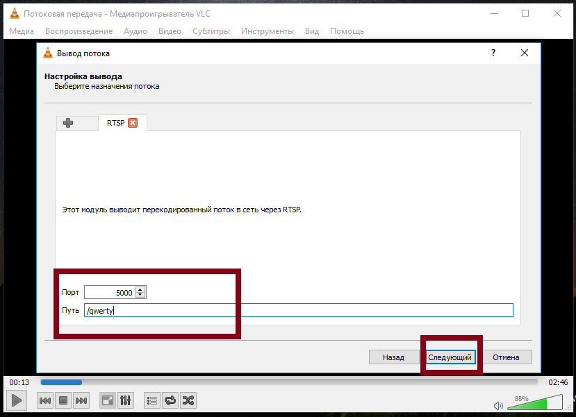 В данном случае (для примера) мы вводим «rtsp://192.168.0.0:5000/qwerty». Нажимаем «Воспроизвести».