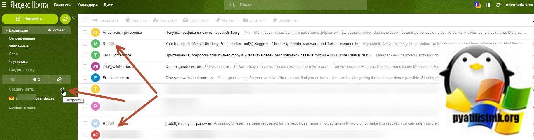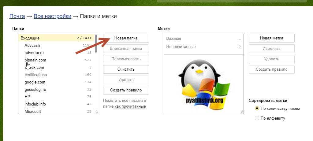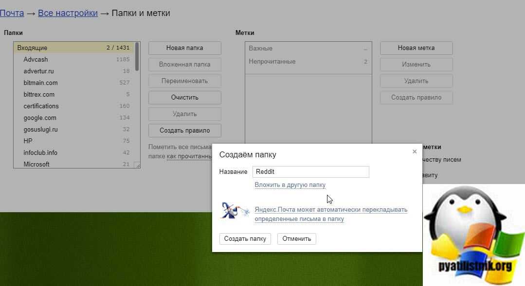 У вас откроются все настройки почтового ящика. Первым делом я вам советую создать отдельную папку под нужный домен или почту по критериям, у меня это будет сервис reddit. Создаю в папке «Входящие» новую папку, для этого нажимаем соответствующую кнопку.