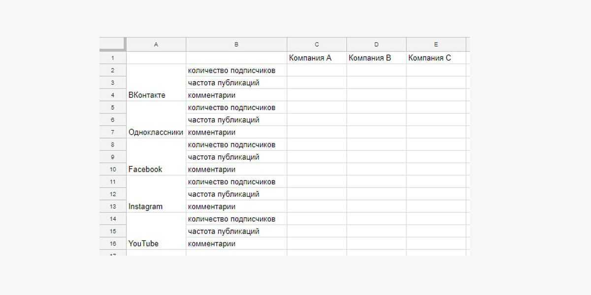Для быстрого, бесплатного и поверхностного анализа конкурентов заведите таблицу, куда вы будете вносить основную информацию. Например, как на изображении ниже
