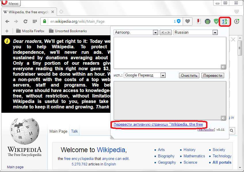 Для того чтобы перевести страницу на иностранном языке, кликаем по иконке Translator на панели инструментов, а затем жмем на надпись «Перевести активную страницу».