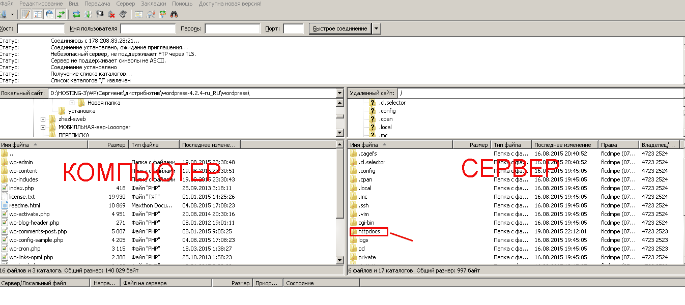 Когда соединение произойдет, увидите, что в окошках справа появятся файлы. Находим корневую папку (httpdocs) ваших сайтов (ведь в будущем вы их поставите несколько):