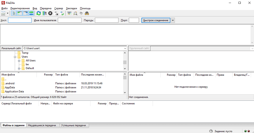 Перед нами откроется основное рабочее поле программы, которое разделено на 6 окон. В первом окне показывается информация о ходе соединения с FTP-сервером. Второе и третье окно — это дерево