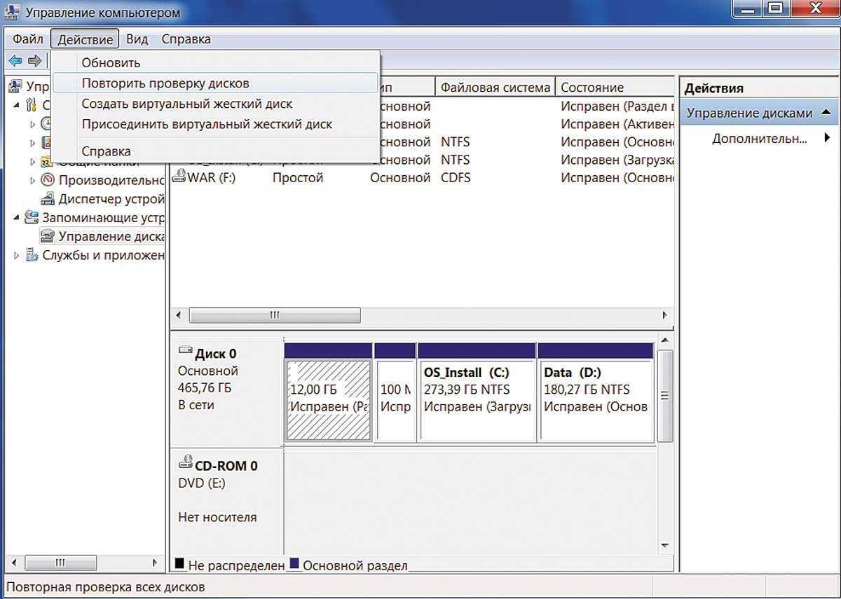 Возможно, что для использования жесткого диска его понадобится активировать из Панели управления. Для этого щелкните кнопку «Пуск» и далее «Панель управления», затем «Администрирование | Управление компьютером | Управление дисками». Выберите «Действие», затем «Повторить проверку дисков». Запустить данную утилиту также получится, если ввести в строке «Выполнить» команду «diskmgmt.msc».