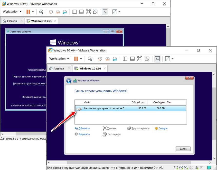 Пару секунд VMware Workstation будет создавать виртуальный диск. Потом ВМ запустится, и в окне программы увидим установочный процесс Windows.