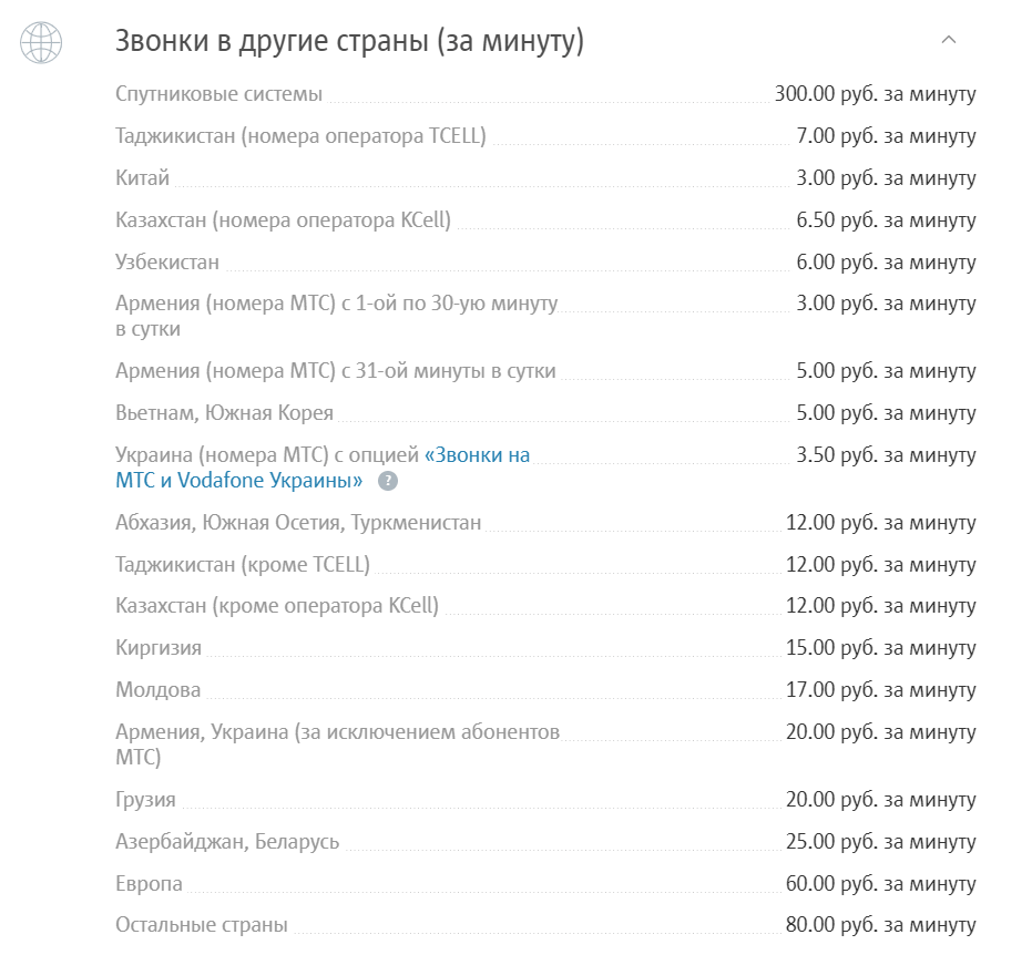 В Москве и Московской области этот тариф не работает. Поэтому мы рассмотрим его версию для Санкт-Петербурга и Ленинградской области. Он создан для гостей региона и включает выгодные расценки на звонки в СНГ и страны Азии. Абонентская плата отсутствует. Все местные вызовы тарифицируются по 2 руб/мин, по России – 5 руб/мин на любые телефоны. Звонки внутри тарифа – бесплатно, что выгодно для групп иностранцев, приезжающих в Россию на заработки. Стоимость звонков в другие страны представим в виде таблицы.