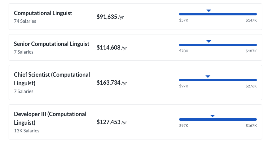 В США, согласно данным Glassdoor, средний уровень зарплат начинающего компьютерного лингвиста составляет около 92 тыс. долларов в год. Специалист высокого профиля может зарабатывать до 170 тыс. долларов в год.