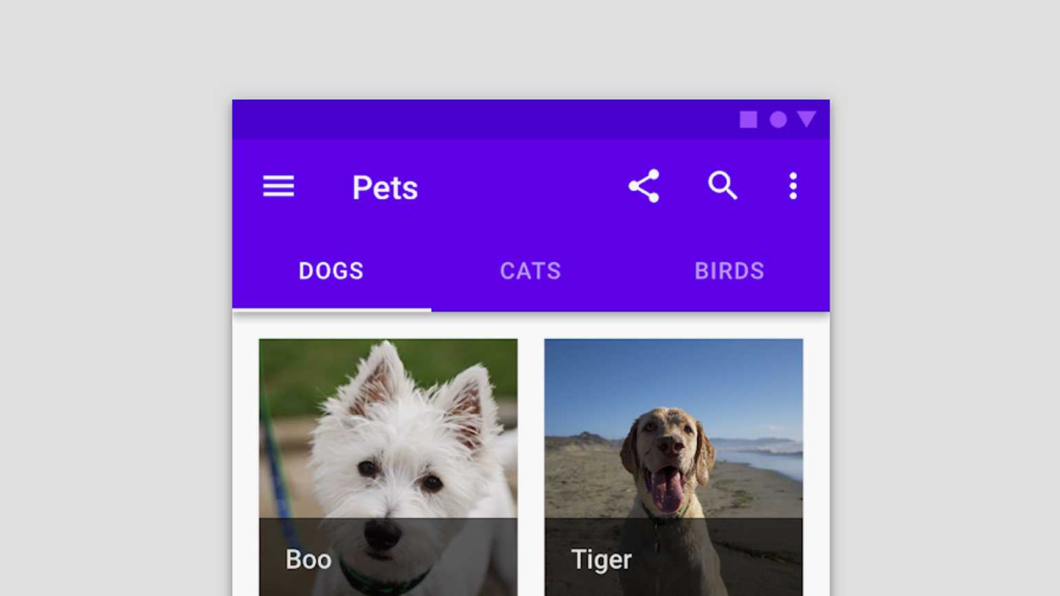 Здесь присутствует несколько типов навигации ― меню-гамбургер, поиск, контекстное менюИзображение: Material Design
