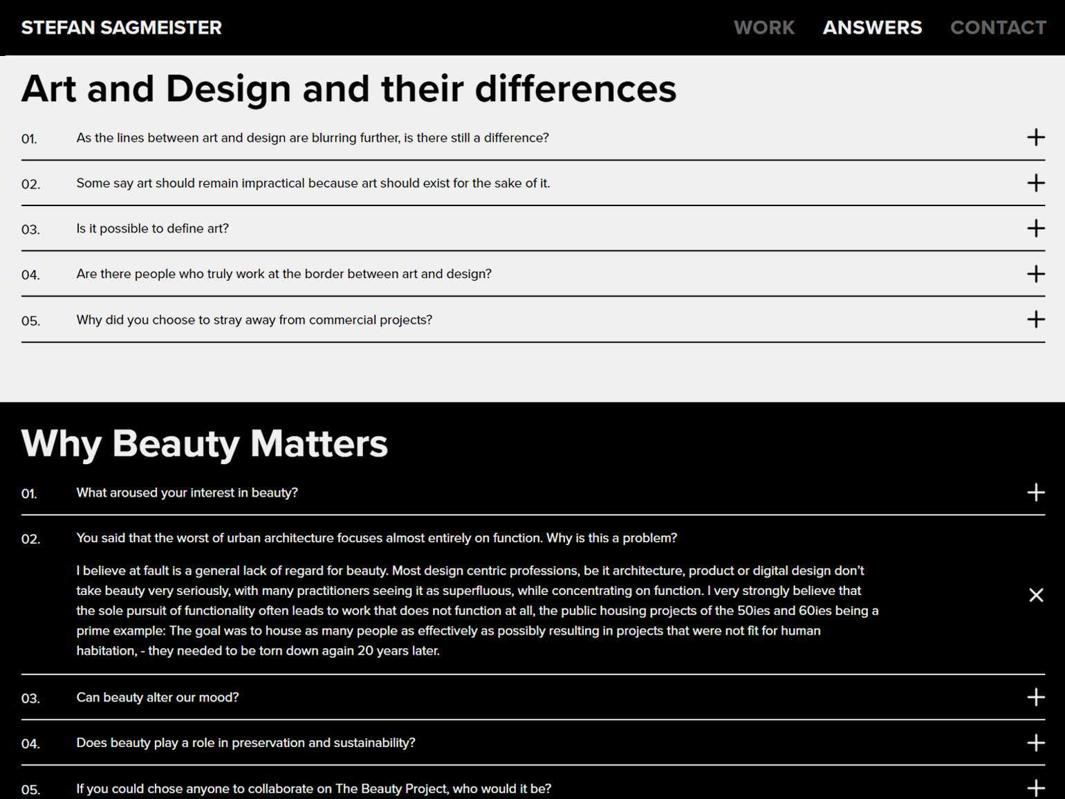 Дизайнер Стефан Загмайстер использует дропдауны для раздела «Вопросы и ответы»Скриншот: sagmeister.com