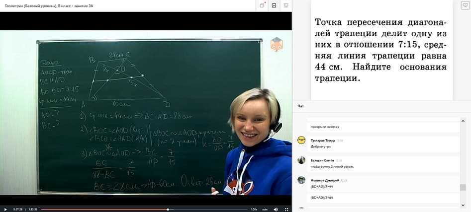 Учитель находится в классе с видеокамерой, а ученики — перед своими компьютерами. Ребята могут задавать вопросы в чате и моментально получать ответы.