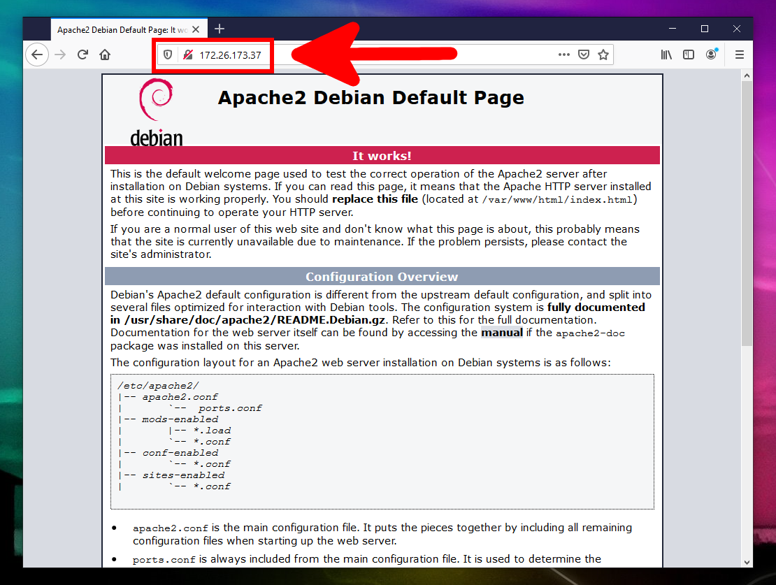 Мы видим «Apache2 Debian Default Page», то есть страницу по умолчанию веб-сервера Apache2 на Debian.