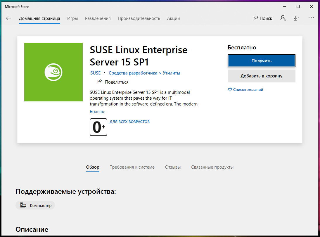 Чтобы установить дистрибутив Linux, щёлкните его, а затем нажмите кнопку «Получить» или «Установить», чтобы установить его, как любое другое приложение Store.