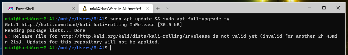 Get:1 http://kali.download/kali kali-rolling InRelease Reading package lists... Done E: Release file for http://http.kali.org/kali/dists/kali-rolling/InRelease is not valid yet (invalid for another 2h 43min 57s). Updates for this repository will not be applied.