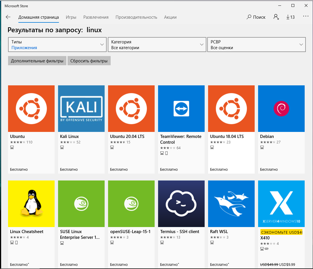И выполните поиск «Linux» в магазине. Выберите Debian или другой дистрибутив Linux из приложения Store.