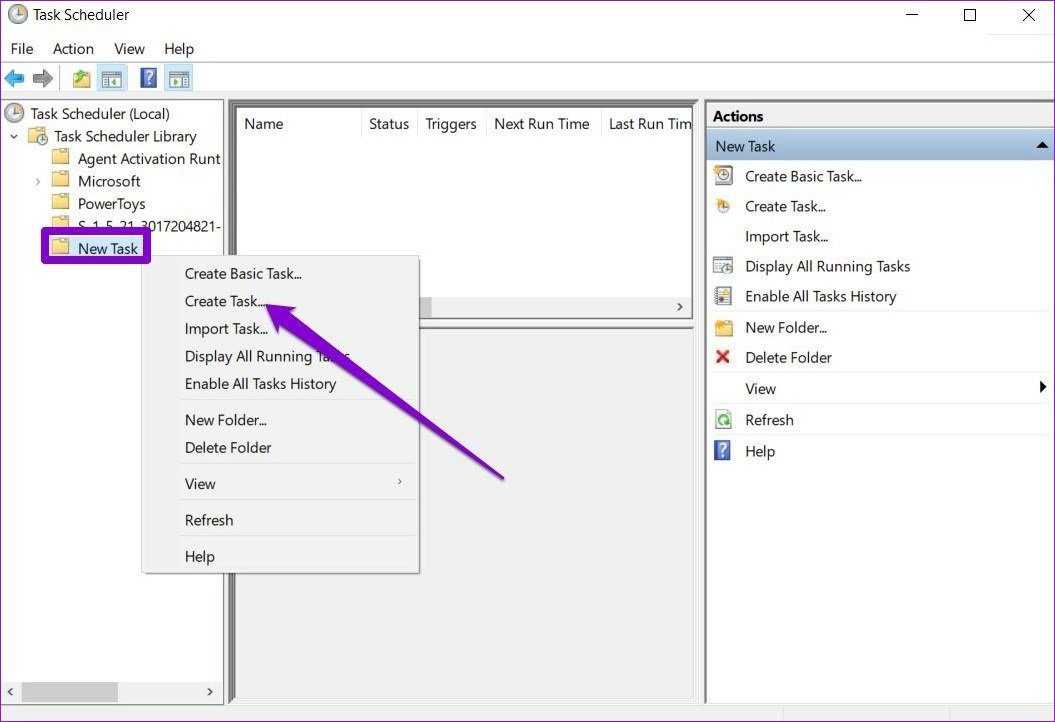 Шаг 3: Теперь разверните папку «Библиотека планировщика заданий» и щелкните правой кнопкой мыши только что созданную папку, чтобы выбрать параметр «Создать задачу».