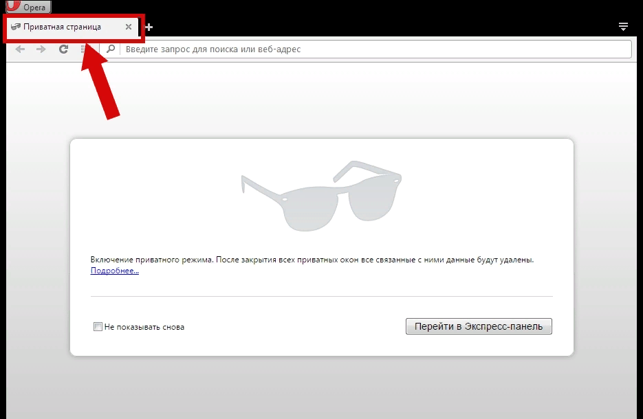 Вы увидите, что окно работает в режиме инкогнито потому, что на стартовой странице в нем будут изображены темные очки.