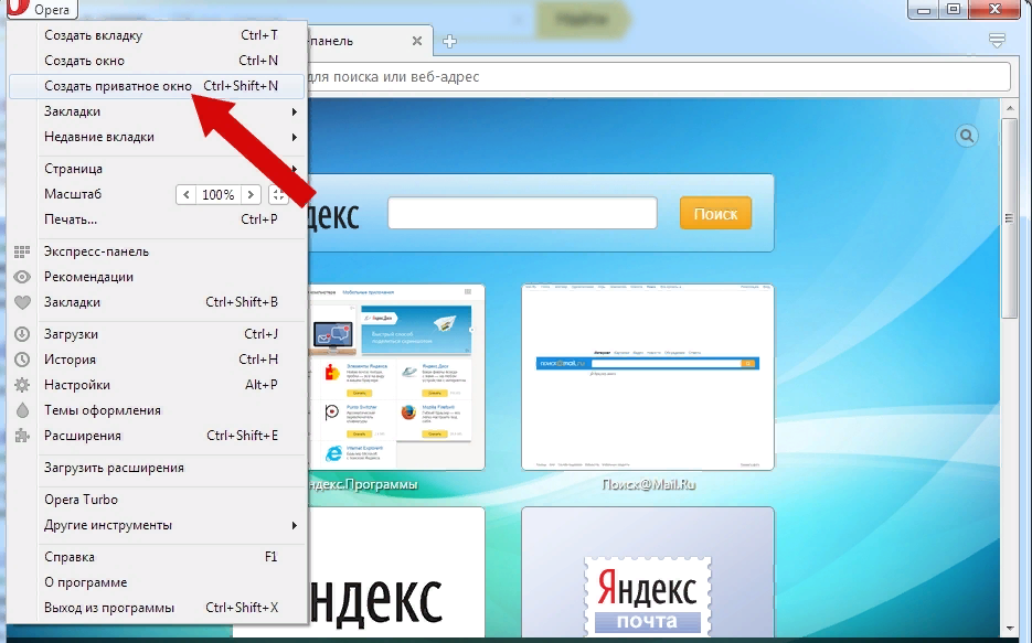 В браузере Opera команда перехода в инкогнито тоже находится в верхней части главного меню и вызывается такой же комбинацией клавиш, что и в Google Chrome.
