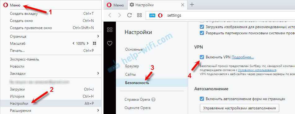 Все что нам нужно, это установить последнюю версию браузера. Затем зайти в «Меню» – «Настройки», на вкладку «Безопасность», и поставить галочку возле «Включить VPN».