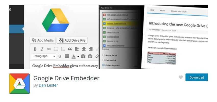 С помощью данного плагина можно встраивать документы из Google Drive прямо в страницу или пост WordPress. Также плагин добавляет прямую ссылку на скачивание файлов. Премиум-версия расширения позволяет обмениваться целыми папками